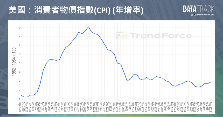 8 月美國消費者物價指數(CPI)季調後月增 0.4%,較 7 月的 0.2% 加速,達今年 1 月以來最高月增幅。CPI 年增率上升至 2.9%,高於 7 月的 2.7%,為 2025 年以來最快年增速度。核心 CPI(不含食物與能源)年增維持 3.1% 不變,月增 0.3%,與 7 月持平,顯示核心通膨壓力仍存在但無明顯擴散。整體數據呈現物價上漲趨勢略微加速,帶動市場對未來聯準會(Fed)貨幣政策的密切關注。