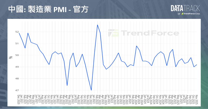 中國國家統計局公布,2025 年 11 月製造業採購經理指數(PMI)為 49.2%,較 10 月上升 0.2 個百分點,但已連續八個月低於 50 榮枯線,創下自 2020 年初疫情以來最長收縮紀錄。Ratingdog 中國製造業 PMI 則升至 51.5%,較 10 月提升 1.2 個百分點,為 7 月以來新高,也高於市場預期的 50.6%,顯示中小企業活動回暖速度加快。整體來看,官方數據反映大型企業壓力仍重,而 Ratingdog 數據顯示中小企業復甦較為明顯,經濟動能仍偏弱但政策效果中,現。