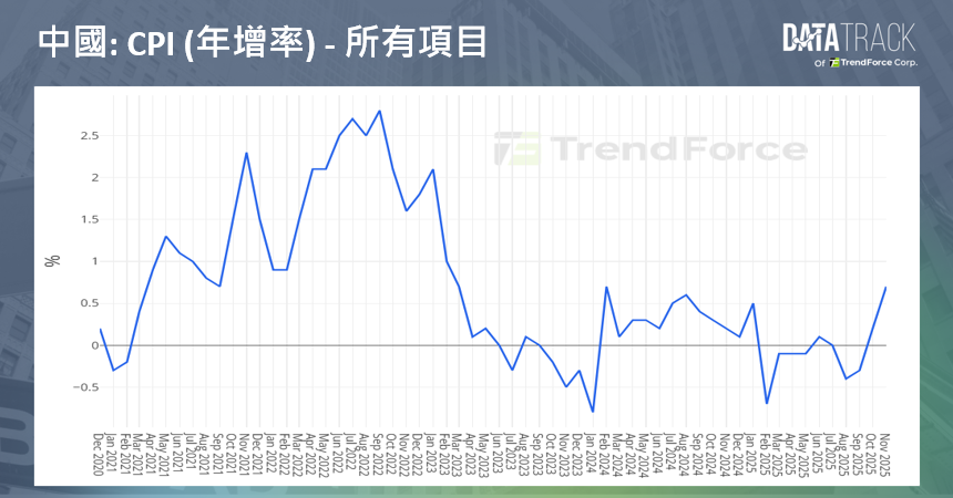中國國家統計局公布,2025 年 11 月消費者物價指數(CPI)年增率達 0.7%,較 10 月的 0.2% 大幅擴大 0.5 個百分點,為 2024 年 3 月以來近 21 個月最高水準,符合市場預期。