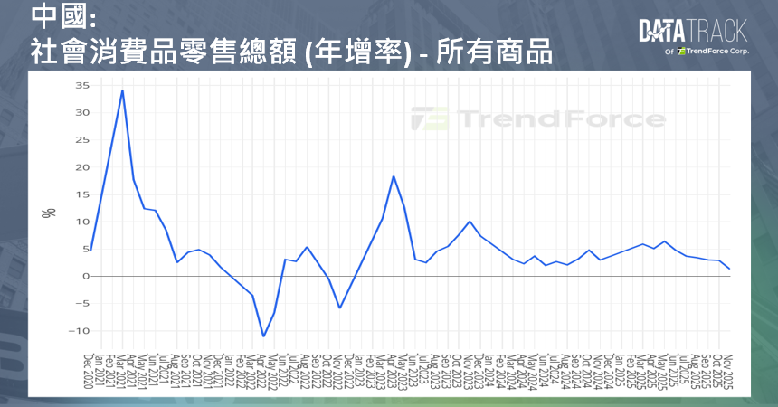 2025 年 11 月,中國社會消費品零售總額約為人民幣 4.39 兆元,年增約 1.3%,明顯低於市場原先預估的接近 3%,亦較 10 月年增率進一步回落,落入 2022 年 12 月以來的低檔區間。與 2024 年 11 月約 3% 的年增率相比,今年同月增速大幅下滑,顯示內需復甦動能持續偏弱。從 1 至 11 月累計來看,社會消費品零售總額年增約 4%,較上半年接近 5% 的節奏略為放慢,反映第三季以來居民消費信心與實際支出逐步降溫。