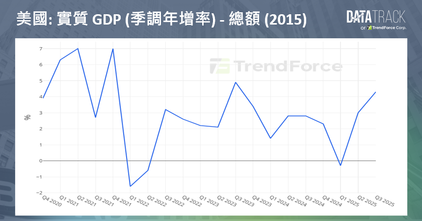 美國商務部經濟分析局於 2025 年 12 月 23 日公布第三季度(7 至 9 月)實際 GDP 季增年率成長 4.3%,大幅優於市場預期的 3.3%,亦高於第二季度最終修訂後的 3.8%,創 2023 年第四季以來新高。同時,GDP 年增率升至 2.3%,較前一季度的 2.1% 明顯上揚。整體數據顯示,即便統計發布曾因聯邦政府關門延宕,美國經濟仍展現高度韌性,其中民間消費為主要成長動能,貢獻超過一半的增幅。
